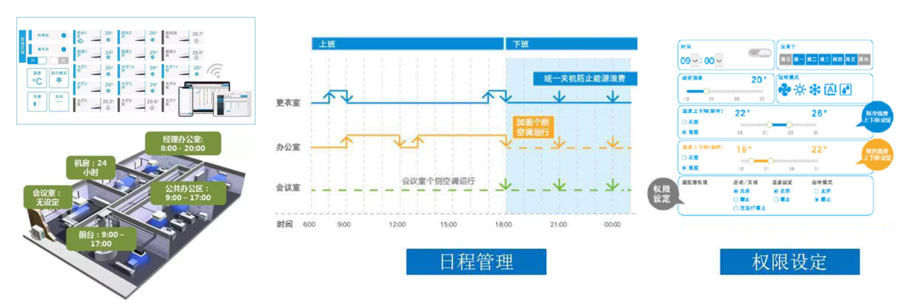 根據(jù)日常使用情況可對(duì)空調(diào)進(jìn)行日程設(shè)定,避免每日手動(dòng)開關(guān)的繁瑣工作,更能有效減免空調(diào)忘關(guān)造成的能源浪費(fèi)。而權(quán)限設(shè)定既可保持靈活的溫度調(diào)節(jié)性,又能防止無(wú)關(guān)人員隨意調(diào)控空調(diào)的情況。